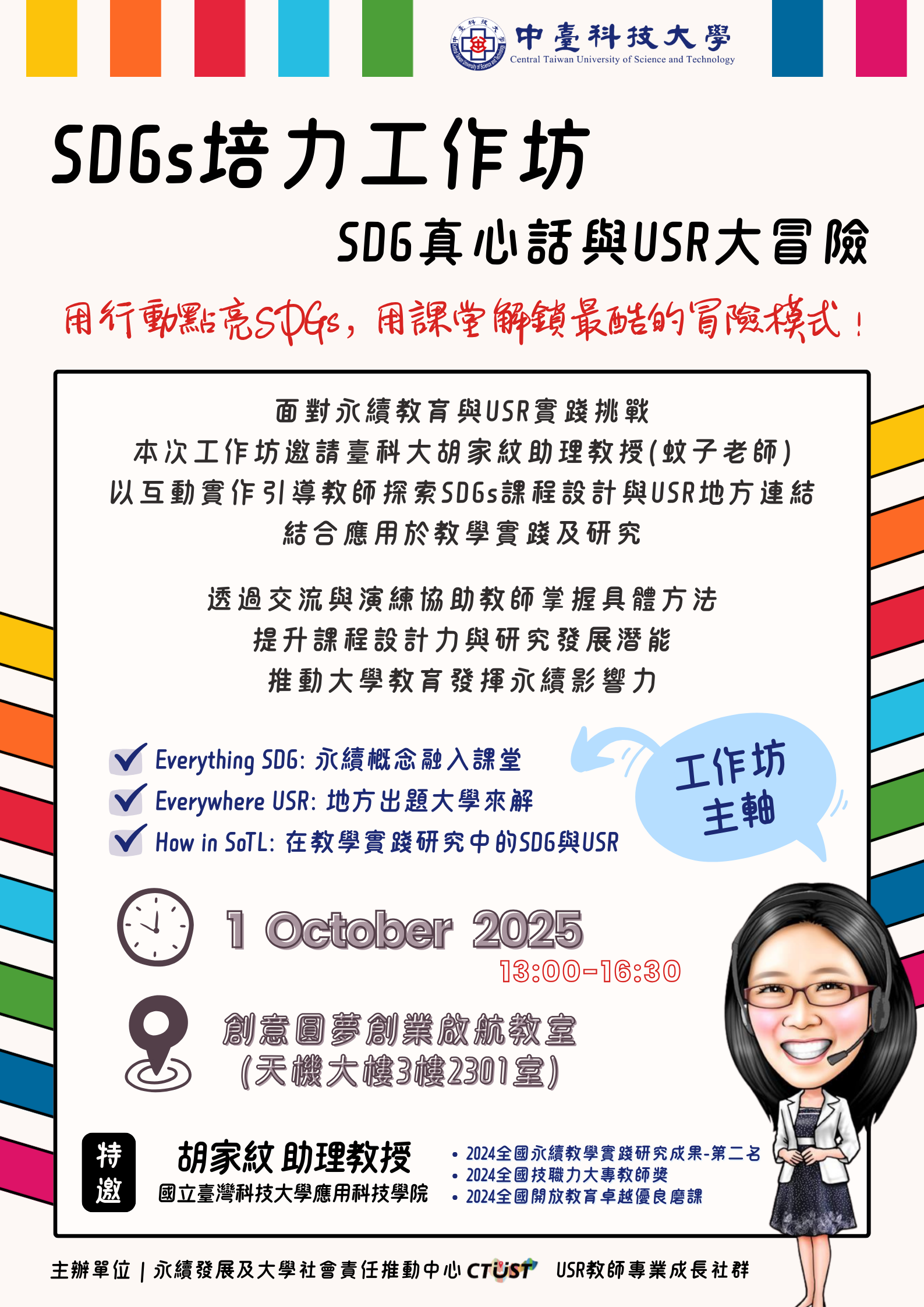 本次特別規劃「SDG真心話與USR大冒險」SDGs培力工作坊,邀請國立臺灣科技大學胡家紋助理教授,帶領本校教師行實作與討論,透過多元互動方式探索SDGs課程設計、USR地方連結、以及教學實踐研究的應用。活動將引導教師從理念出發,實際演練如何將課堂轉化為永續行動場域,並透過交流激盪出跨領域合作的可能性。